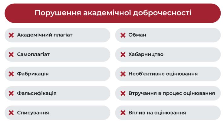 Академічна доброчесність – це сукупність цінностей, етичних принципів і заснованих на них правил, визначених законом, якими мають керуватися суб’єкти академічної діяльності та учасники освітнього процесу під час навчання, викладання, наукової або творчої діяльності.